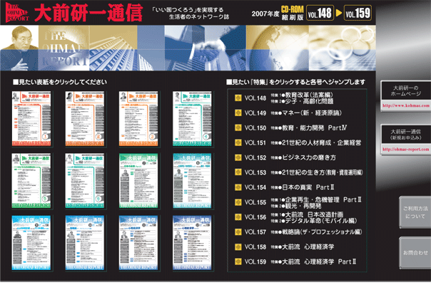 各年度版とも、大前通信1月号〜12月号までの大前研一が発信するほぼ全ての編集記事を一枚のCD-ROMに完全収録!